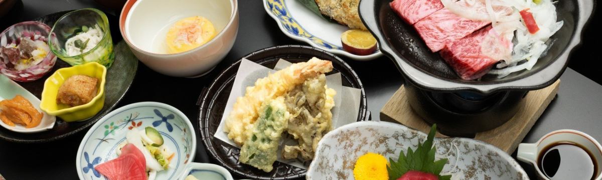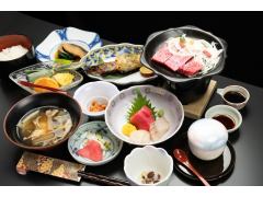 這是一個以柏木浴缸為方案房間的晚餐範例。陶盤烤製的國產和牛、三陸直送的生魚片、時令手工料理等一應俱全。 - 烹飪的例子